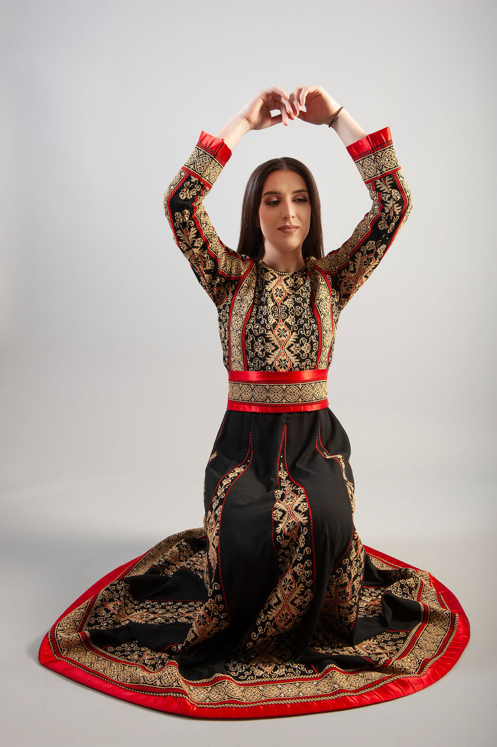 dress intricate embellishments, a gracefully wrapped waist belt, and a long sleeve for added refinement