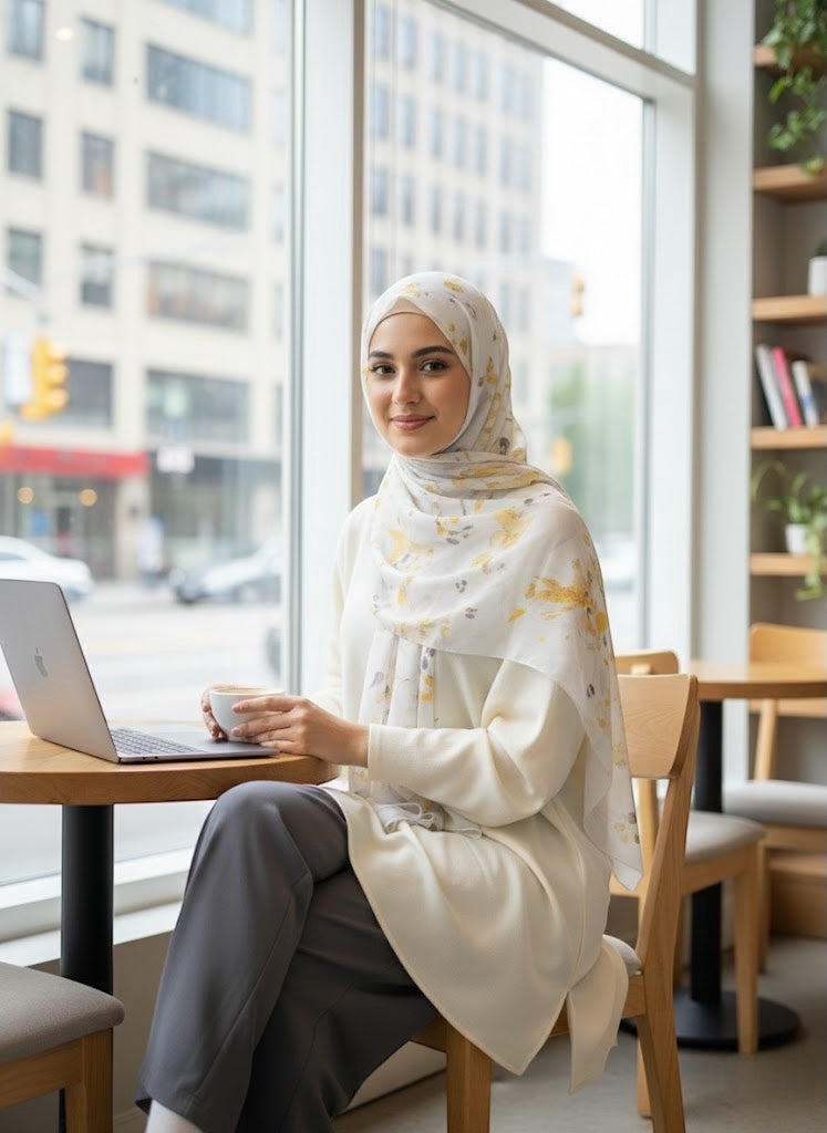 This ethereal hijab is crafted from a lightweight, breathable chiffon (or similar flowy fabric), ensuring a graceful drape and ultimate comfort throughout the day. The crisp white canvas is beautifully adorned with a delicate, scattered floral pattern featuring soft grey/yellow accents and striking touches of metallic gold (or bright mustard yellow), giving it a luminous, elevated finish.